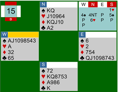Minor Suits - Use Keycard Gerber When You Can Okay, but what about minor suits? Can this be modified to work with minors? I really recommend that you work out a way to agree on Gerber with MSK responses because asking bids starting with 4NT do not work well with minors. Minor suit slams are always going to be difficult. And remember, you can't show three keycards with a specific void by jumping to the six level because you would then be propelled into a grand slam, but you could jump to six of your minor promising three keycards and also a void in a higher suit. MSK isn't meant for minors, but then, neither Standard Blackwood nor Roman Keycard Blackwood work very well with those suits either. We've just run out of bidding room! But if you find yourself in a bidding situation where you must use 4NT to ask about keycards then use the same responses as you would for majors. So call it mSK, minor Suit Keycard, with a lower case letter "m" if you like. This is an old convention that's not much used, but can be very helpful - After your side agrees on a major suit as trump you can use a bid of 3NT to ask for aces. You can use any flavor of Blackwood you like, too. If you prefer the old fashioned style or can't give up Roman Keycard you might still consider this agreement. It's important that both partners know they have agreed on either hearts or spades as the trump suit when they use this convention! My partners and I also have an implicit understanding that an immediate response of 3NT to a major suit opening is an agreement on that suit as trump and is MSK. It sure beats using 4NT and having to stop at the 5-level when you don't have enough horsepower. And... Let's agree that in the interest of good bridge the partner initiating the sequence should have at least one keycard.